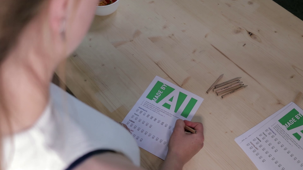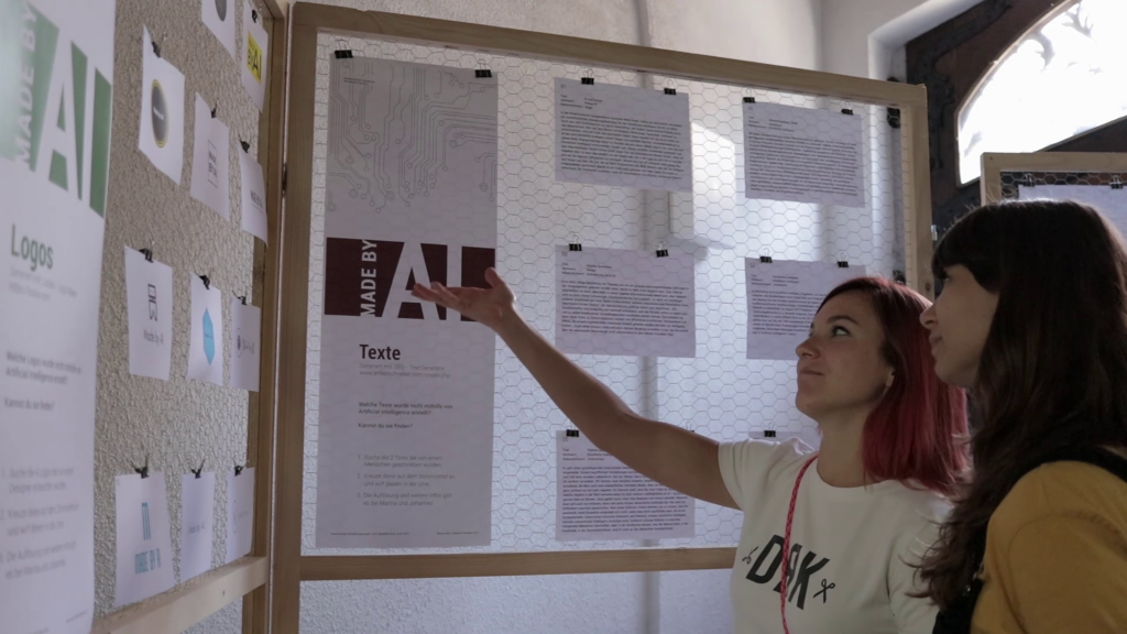 Sowohl die Auswertung der Stimmzettel, als auch die Interviews haben interessante Ergebnisse geliefert und unser Empfinden auf während der Ausstellung sehr gut wieder gespiegelt. Die Befürchtungen vor einer ablehnenden Haltung gegenüber AI im Design Beruf haben sich nicht bewahrheitet. Die Mehrzahl der Besucher war unterstützenden AI Tools gegenüber sehr positiv gestimmt und fast alle können sich vorstellen in Zukunft mit intelligenten Tools zu arbeiten, die den Arbeitsalltag erleichtern und nervige Aufgaben übernehmen. Dabei waren die für die Ausstellung verwendeten Tools für die meisten Besucher völlig neu. Die Begeisterung an den Tools und diese selber auszuprobieren war sehr hoch. Auch haben sich die wenigsten bereits intensiv mit AI auseinandergesetzt und fanden es toll auf spielerische Art an das Thema herangeführt zu werden.